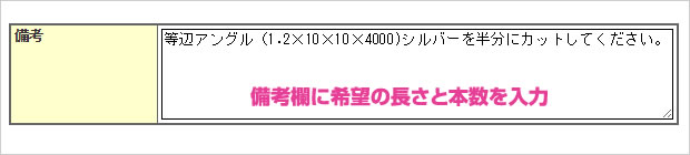 次へ進むと備考欄がございますので、ご希望の商品をどのようにカットするか、長さと本数をご入力下さい。複数の商品のカットをご希望の場合は、それぞれについてご記載下さい。